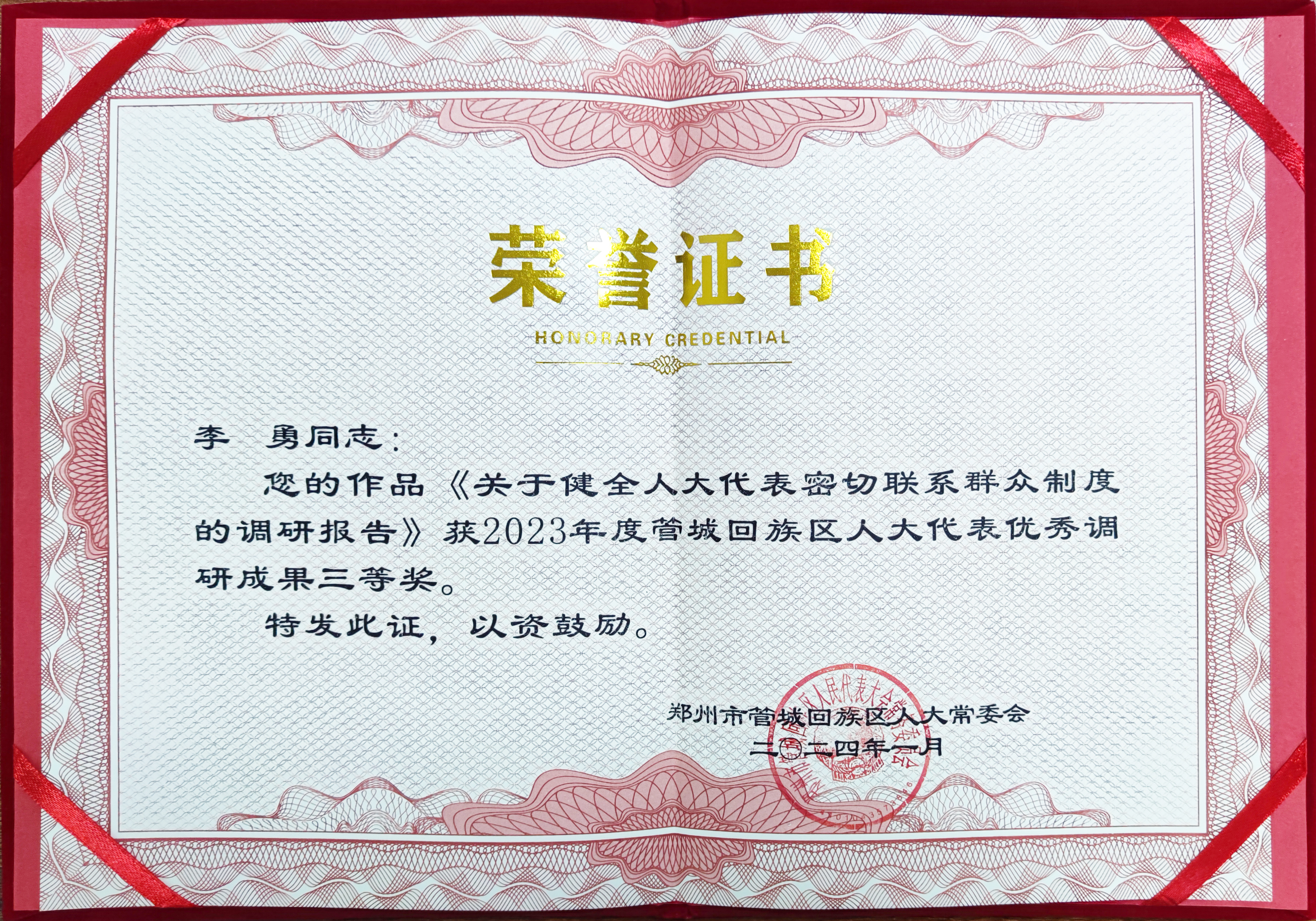 2023年度管城回族區(qū)人大代表優(yōu)秀調(diào)研成果評選結(jié)果揭曉——我院黨總支書記、院長李勇調(diào)研成果《關(guān)于健全人大代表密切聯(lián)系群眾制度的調(diào)研報告》榮獲三等獎!